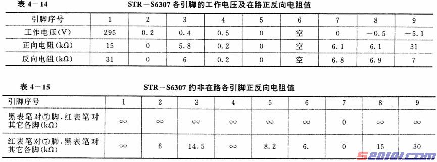115V输出为零,说明电路没有起振,应检查开关振荡电路的R805、R806、D802、C812、R815、R855、R866和IC802等元件。检查IC802时,可用万用表检查各引脚对(2)脚的正反向电阻。IC802(STR—S6307)正常时的实测数据如表4一14和表4一15所列。