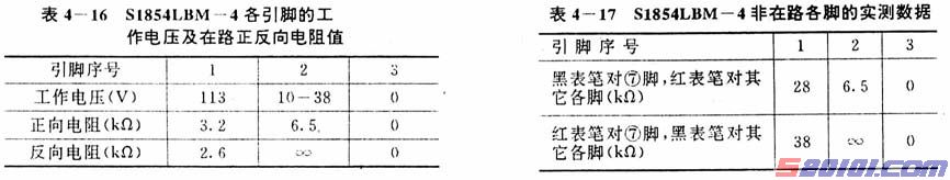 S1854LBM—4系电源保护厚膜块,当其(2)脚开路,主电源113V因失控会上升到150V,电源失去保护,(1)脚与(3)脚短路,电源会关闭保护而无输出;(2)脚正常工作电源为5mA左右,当上升到8mA到10mA时,电源保护停机,+B(113)无输出,主电源113V正常工作时电源450mA,当大于500mA时电源自动关机保护。S1854LBM一4正常时各引脚的工作电压及在路正反向电阻值见表4—16所列,开路电阻见表4—17所列。