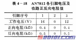 主开关电源十12V输出电压所用的三端稳压器AN7812(IC801)正常时各引脚的工作电压及在路正反向电阻值见表4一18所列。