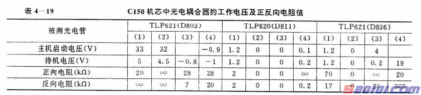 在松下C150机芯电源电路中,使用了三只光电耦合器——D801、D81l、D836.它们正常时各引脚的工作电压及在路正反向电阻值见表4一19所列。