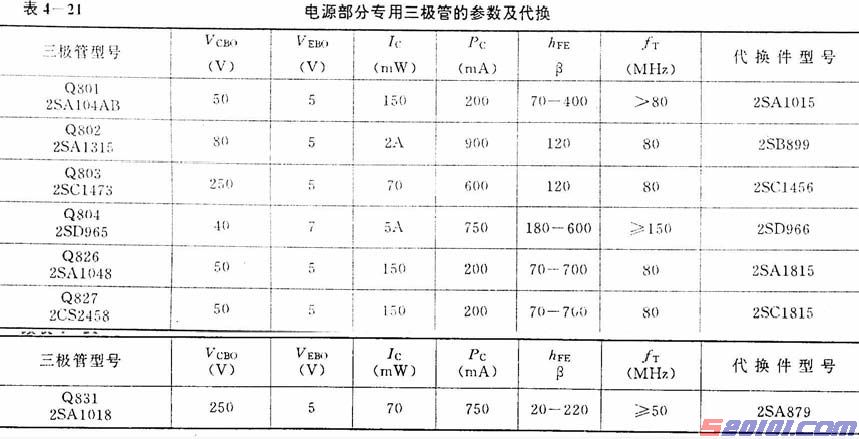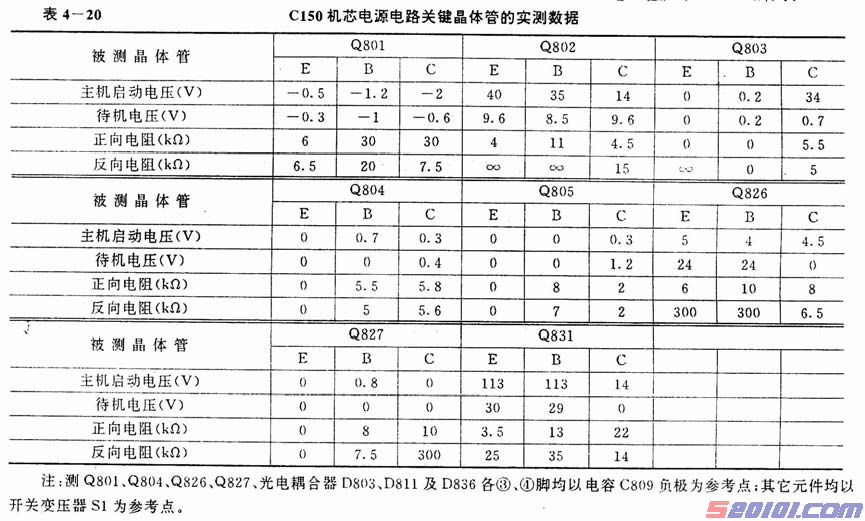 松下C150机芯电源电路中的主要三极管正常时,各极电压及在路正反向电阻值见表4—20所列。