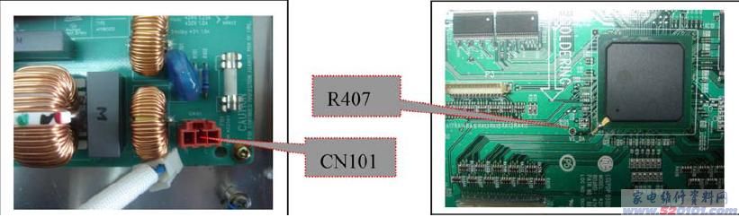 方法二:将电源板上的开关SW601 拨到AUTO 端; 将逻辑板上的电阻R407 取掉(下右图); 把AC 220V 直接接在电源板插座CN101 上(下左图),屏幕显示滚动测试画面(各种测试卡),说明屏和屏上组件组件正常。