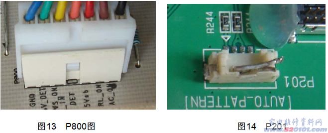 将电源板插座P800 的3 脚(5VSb)与5 脚(VS-on)接一个5~10K 电阻(见下左图); 将逻辑板插座P201 的1、2 脚短接(见下右图); 接通AC 220V 电源;若屏和屏上组件正常,应显示测试画面。