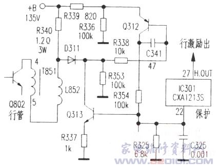 附图中R340为行扫描过流保护电路中检测电阻,Q312、Q313为过流保护控制管。在正常情况下Q312截止,Q313也截止,Ic301 22脚电压为0V,IC301内部的保护电路不动作,IC301 27脚输出行激励脉冲正常工作。当R340变质使其阻值增大后,其两端压降随之增高,致使Q312导通,Q313也导通,随着Q312 b极电压降低,导通程度不断加深。使IC301 22脚出现高电平,内部保护电路动作,27脚无行激励脉冲输出而自动关机。