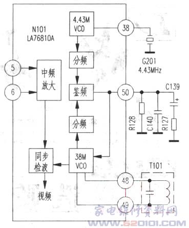 后查阅资料得知,LA76810A视频检波采用PLL锁相环同步检波方式。见附图,图像中频放大电路放大后的图像中频信号送同步检波电路,在此电路中图像中频信号和参考载波信号(由图像中频压控振荡器产生)进行检波,解调出视频信号和第二伴音中频信号。同步检波所需的参考载波信号,则由图像中频压控振荡器(38MHzVCO)产生。该压控振荡器实际上是一个锁相环路(PLL),其工作过程是:LA76810A 48、49脚内电路及外接的LC组件组成压控振荡器,产生的振荡信号一路送同步检波电路,另一路经分频后送鉴频器。4.43MHz色副载波经分频后也送鉴频器,在鉴频器中两信号进行频率和相位比较,当两者的频率和相位不一致时,检出误差信号,经50脚外接阻容元件组成的双时间常数滤波电路平滑滤波,得到直流电压,送38MHz压控振荡器,控制振荡器的频率和相位,使振荡器产生的振荡频率和相位始终与高频头输出的图像中频(38MHz)信号的频率和相位一致,使同步检波电路解调出的图像信号电平幅度最大。调节图像中周T101,可微调图像中频VCO的频率。采用以上PLL压控振荡器产生的参考载波信号的频率、相位及幅度都很稳定,且不受图像内容变化的影响,从而改善了图像同步检波电路的检波特性和具有良好的抗干扰性,使图像和伴音质量有明显提高。