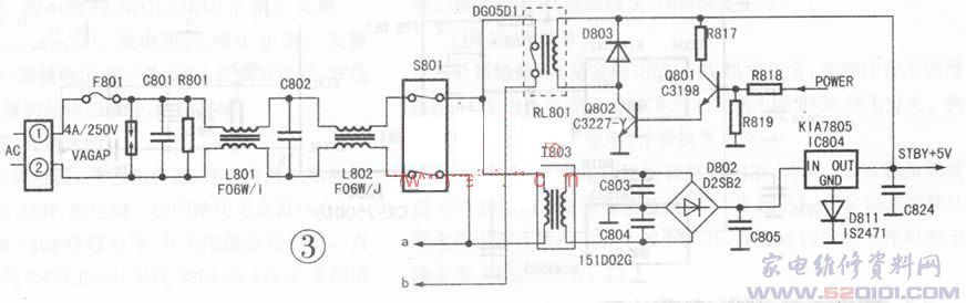 40PAl0机型副电源原理电路如图3所示,它由工频变压器T803、整流桥堆D802和三端稳压器IC804组成,属于传统线性稳压电源。合上电源开关S80l,电网交流电由两级共模滤波器滤除高频干扰脉冲,得到的纯净交流电压加到T803的初级绕组,降压变换后经D802、C805整流滤波产生约+9V直流电压,然后由IC804稳压调整成STBY+5V电压,给控制系统供电。