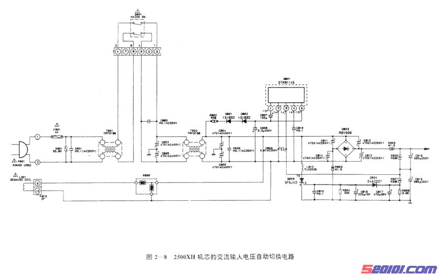 如图,它主要由可控硅 Q808、整流桥堆 D803、稳压管 D804、开关厚膜块 STR81145