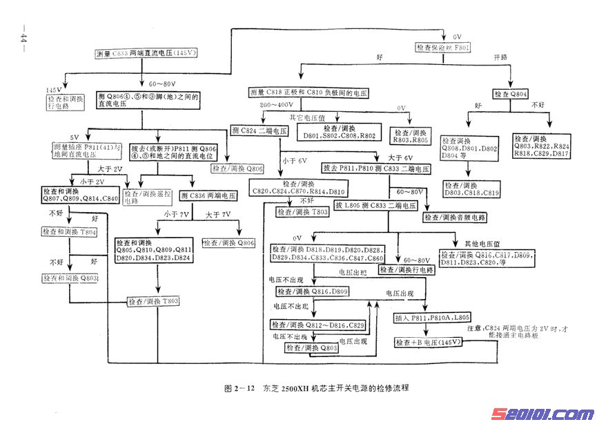 损坏,如 C829、D812~D804 等元件有无开路或击穿现象。 具体检修时,可按图 2 一 12 所示的流程进行。