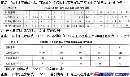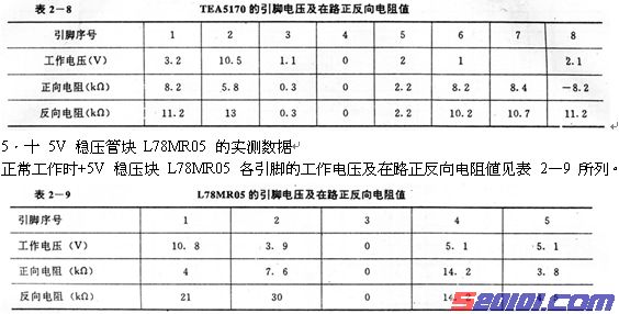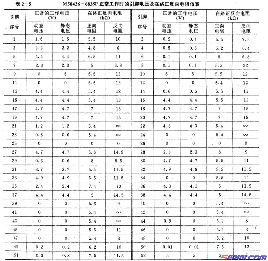 正常工作时微处理器 M50436—683SP 的工作电压及在路正反向电阻值见表 2—5 所列。