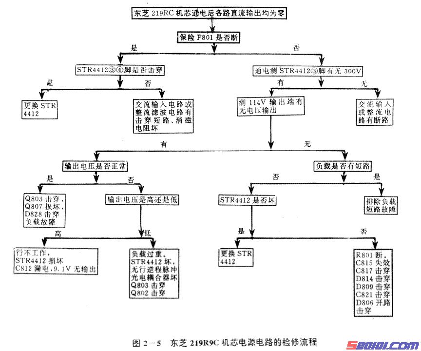 东芝 219R9C 机芯电源电路的典型故障常表现为:通电后各路直流输出均为零,电视机 面板的指示灯不亮,无光栅、无图像、无伴音。具体检修步骤与方法可按图 2—5 所示的故 障检修流程进行。