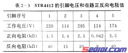 STR4412 正常时各引脚的工作电压及在路正反向电阻值见表 2—3 所列。