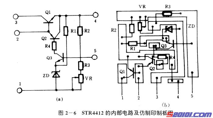 STR4412 内部电路见图 2—6(a),其中(1)脚为接地端;(2)脚为内部开关管基极启动脉冲 输入端;(3)脚为内部开关管集电极,外部为整流滤波后的脉冲直流电压输入端;(4)脚为内 部开关管发射极,外部为直流电压输出端;(5)脚为误差电压取样端。STR4412 损坏后,可 直接代换的厚膜块有 STR40115。另外 STR5312、STR5313、STR5412 等也可以变通代换.只 要将它们的(1)脚与(3)脚对换焊接,即(1)脚焊到原机 STR4412 的(3)脚处,(3)脚焊到原处。 如果一时无上述代换件,则可以采用分立元件进行仿制代换,用分立元件仿制 STR4412 的