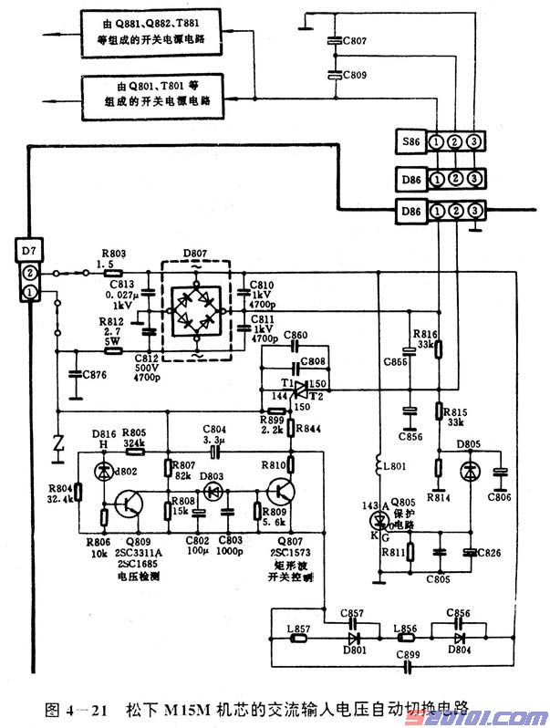 松下M15M机芯的交流输入电压自动切换电路的切换点电压为150V。切换点电压设定电路主要由取样电阻R804、R805,稳压二极管D802等组成。