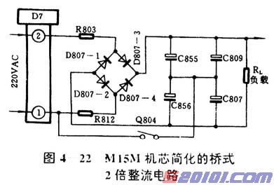 在上述分析中,只考虑C855//C809、C856//C807的充电过程。并未考虑其放电的影响。事实上.由于负载RL的存在(阻抗一般不高),在正半周时在C855//D809上充电到2Vin后,D807—3管将截止。这时.C855//C809上的电压将通过RL→D807一2→R812→导通的Q804进行放电;在负半周时,当C856//C807充电到2Vin后,D807—1管将截止。这时,C856//C807上的电压将通过导通的Q804→R812→D807—4→RL进行放电。由此看出,实际加在RL上的电压应为2Vin。在整机中两种电压方式下的整流过程如下: