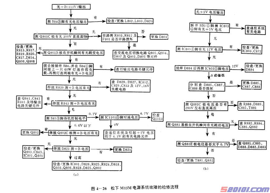 待命电路的检修,可通过其是否动作来初步判别。当它动作时,故障在待命电路的控制及待命电路中,应从IC1101的(32)脚开始,逐级追寻至待命电路终端。如果待命电路未动作,则故障在开关电源本身,应重点检查电源启动支路、正反馈环路、开关管Q801及开关变压器T801等。