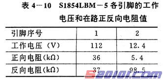 电源厚膜块S1854LBM一5的各引脚电压及在路正反向电阻值见表4一l0所列