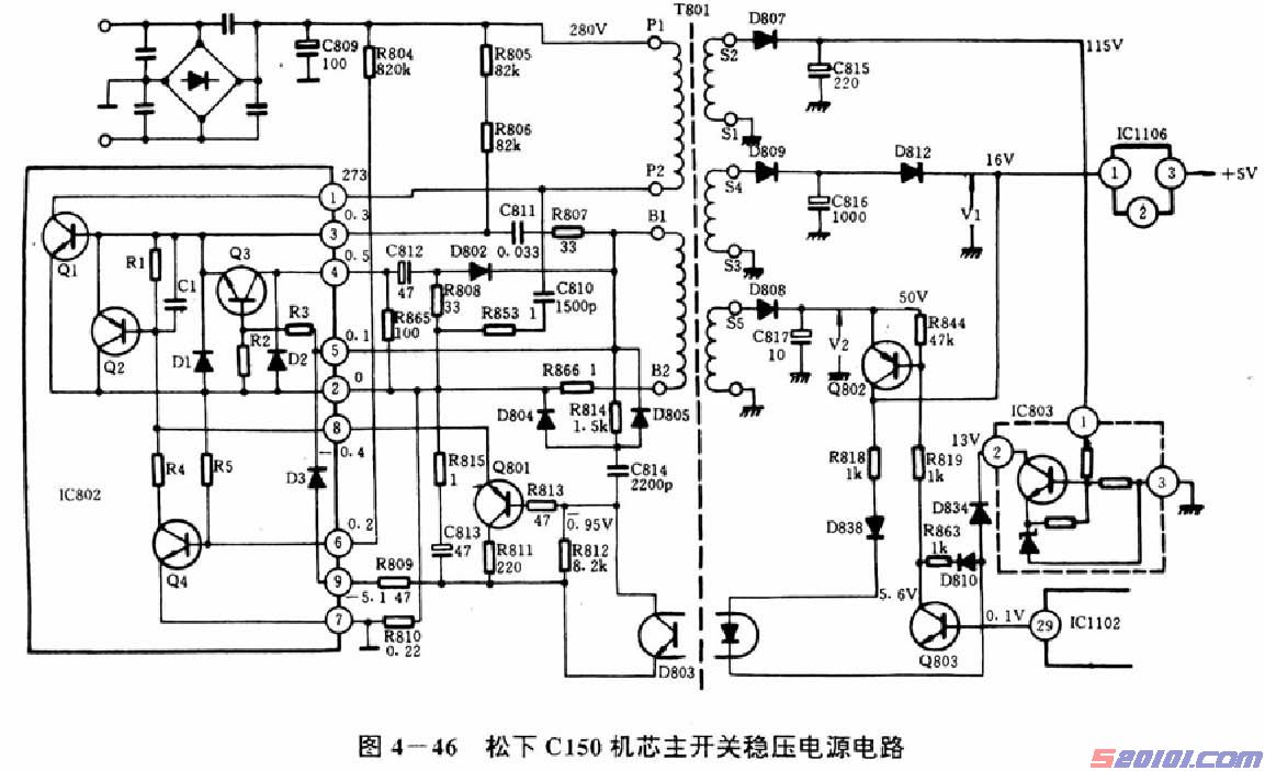 开关管Q1集电极输出的脉冲电压经T801耦合到次级,由D807、D808和D809整流得到115V、50V和16V电压。电路设计为:开关管Q1导通期间,整流管D807等截止;Q1截止期间,D807导通。