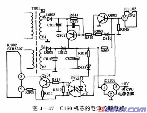 C150机芯的电源控制电路即遥控关机(实际上为待机)电路见图4—47所示。