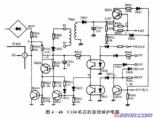 当115V输出端短路时,D830导通;50V负载短路时,D837导通。其结果都使C点电位几乎为零,D811截止,B点电压升高,最终使Q1停止振荡,实现保护。16V电压为零时.C点电位也为零,同样处于保护状态。