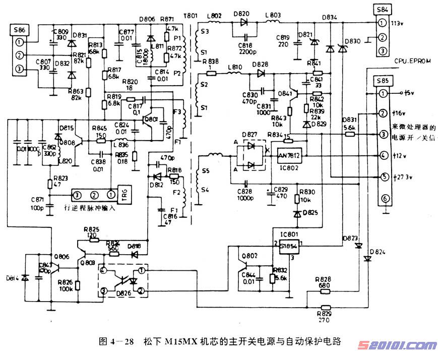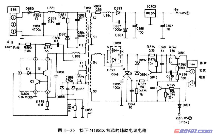 开关变压器T881次级两绕组S2~S1、S4~S3输出的矩形脉冲电压经相应的整流、滤波后.再经稳压处理输出两组稳定的直流电压。其中,由三端稳压电路IC803(78L05)输出+5V电源,冉由插座S85的(1)端供给微处理器控制系统作工作电源。稳压二极管D884作三端稳压器输入端的过压保护。T881的84~S3输出的矩形脉冲电压经D891整流、C895滤波后.在C895两端建立30V的脉动直流电压,该电压再经调整管Q810、C839、R849等组成的有源滤波电路后,输出约24V的稳定电压.由插座S94供伴音功放集成电路作电源(CX型采用LA4280.C型采用AN7158)。
