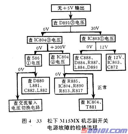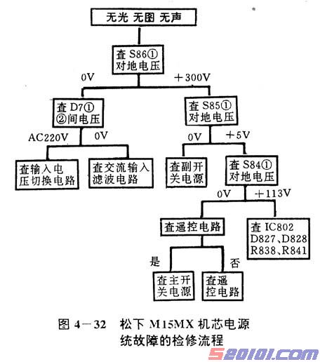 M15MX机芯副开关电源主要故障表现为无+5V输出或图像正常而无伴音。无+5V输出会导致遥控电路不工作;无伴音则多为伴音电源电路故障,两者是独立的,因此很容易确定故障部位。副开关电源检修流程见图4—32所示。