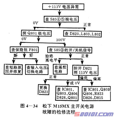 在检查松下M15MX副开关电源即遥控电源电路之前.应确认交流输入电压切换电路处于正常的工作状态。交流输入电压自动切换电路的常见故障表现为:因交流输入电压自动切换电路的元件损坏或参数变化引起电压切换点升高.以至在160V以上时仍工作在倍压桥式整流状态。从而导致输出直流电压过高.迫使保护电路动作,可对图4—27进行检查,在查明切换电路元件完好的情况下,可通过适当改变分压电阻R805或R804的阻值予以解决。