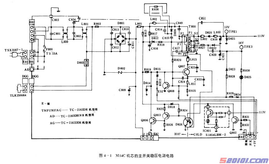 松下M14C机芯的主开关电源电路见图4-l所示(以松下TC一2163DR型机为例)。