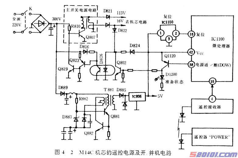 松下M14C机芯的遥控电源(即辅助电源)及主电源的开/关机控制电路见图4—2所示。