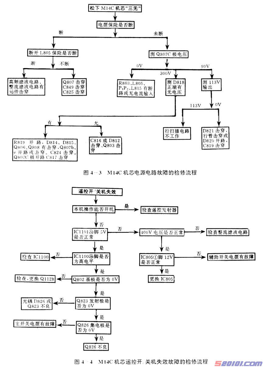 当Q1113为高电平输出时,应进一步检查电源部分的待命电路。该电路中Q802基极电压应为饱和导通电平,否则应检查电压传输路径(连接线等)。当Q802基极电压正常、集电极为低电平时.则检查Q803集电极输出是否为0.7V.输出电压若低于0.7V,应检查D826、D803。若Q803集电极电压为正常值0.7V.则更换D306。这一故障的具体检修流程见图4—4所示。
