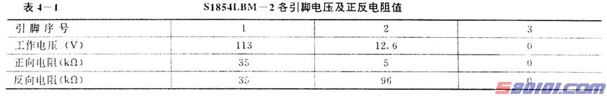 正常时电源误差取样厚膜块S1854LBM一2各引脚的工作电压和在路各引脚对地正反电阻值见表4一l所列(用500型万用电表在松下TC一2163DR型机上测得,以下均同)。