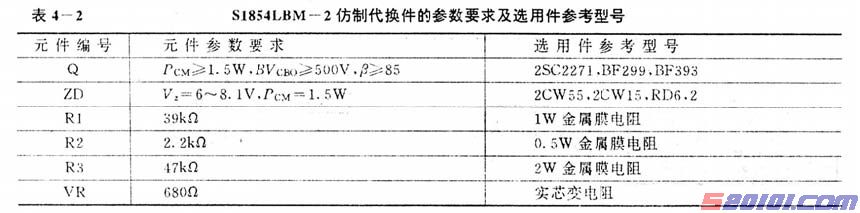 S18542LBM一2为单排直插式3引脚,其中(1)脚为113V直流电压取样端;(2)脚为输出端;(3)脚为接地端。内部电路见图4一5(a)所示。在实际维修过程中,可直接代换S1854LBM一2厚膜块的代换件有SE110N、SE139NLF4以及S1854LBM一4等。也可用分立元件代换S1854LBM一2。其印制板图见图4—5(b),其中各代换件的参数要求及选用件参考型号见表:4—2。