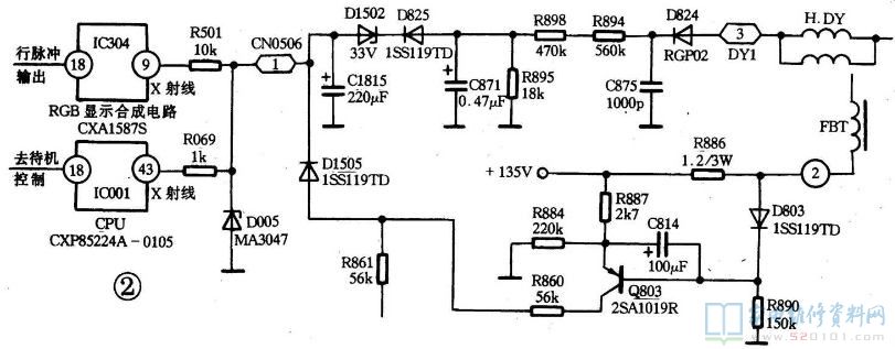 在正常情况下,行扫描偏转线圈的连接端子③有240VHpp行扫描逆程脉冲。若发生异常情况致使该脉冲幅度增大,此脉冲经D824整流后在C875上的电压也增大,C875上的电压经R894、R898、R895 分压后使 D825、D1502 导通,于是 IC304(CXA1587S)的(9)脚和 IC001(CXP85224A-0105)的(43)脚获得高电平。IC304(CXA1587S)将停止在(18)脚输出行扫描激励脉