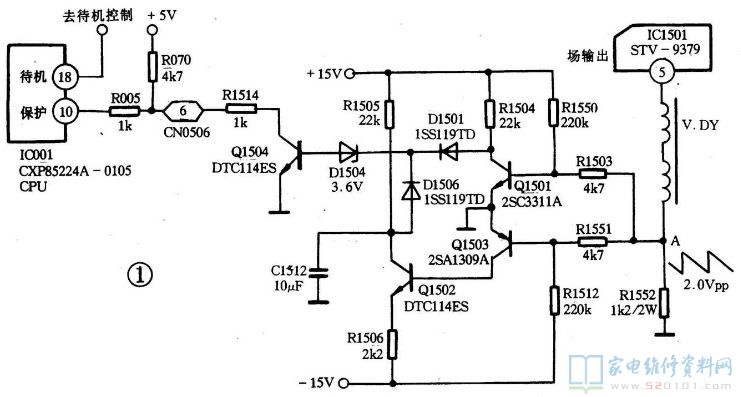 如果IC1501异常,使A点电位高于0V,则Q1503 截止,Q1502 截止,D1506 导通,D1504导通,Q1504导通,送入一个低电平信号给CPU的(10)脚,整机将处于保护状态。另外,如果行输出级提供的-15V电压因故障消失为0V,也会引起保护电路动作。这时Q1502、Q1503不可能导通,于是D1506、D1504、Q1504导通,CPU的(10)脚也将被置为低电平。