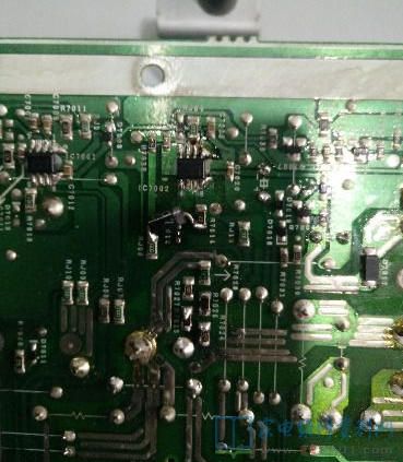 故障检修:拆机检查,输出电压全部为0伏。拆下电源板单独维修。该机待机电压由集成块30D16完成,不上电对线路粗测,保险完好,功率功和限流电阻完好,测量30D16电源板8脚阻值正常,6脚阻值为0欧。取下该7脚集成块,6脚对地电阻值正常,换上30D16。试机还是不亮,测量8脚电压为0伏,正常为300伏。往前测量发现D12二极管不通,用的一只RF207裝上去,试机一切正常。