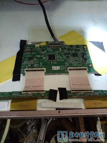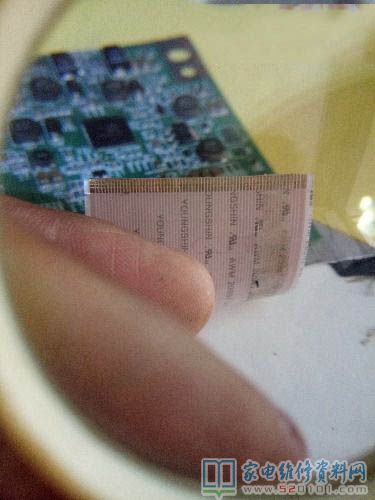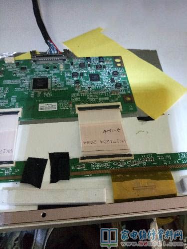 逻辑板到边板是双排线,拿下右排线开机左半屏白光没有头像,拿下左排线开机右半屏有头像也闪烁,根据以前用的“隔离方法”试一试,首先取下右屏线,剪好几毫米的透明胶带贴在右屏线的金属片上一段一段的试机,当试到粘贴住第4-12(从右到左数)线时头像正常不再闪烁,大功告成,又一台隔离法修屏成功。