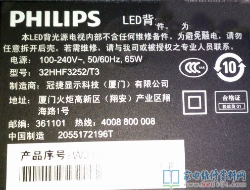 接修一台飞利浦32寸液晶电视,型号是32HHF3252/T3,故障表现为开机黑屏,有声音,无光,看不到图像。 客户要求上门维修服务。上门后,经过观察故障现象,发现电视机开机后,声音正常,仔细观察发现有隐约的图像,此时已经确定问题出在了,背光电路中的驱动电路或灯条损坏,造成的无背光故障,拆机后直接测量背光灯条的供电接口电压,开机瞬间电压从105V逐渐的降到40V上下,反复试验均是如此,由此判断灯条损坏了。