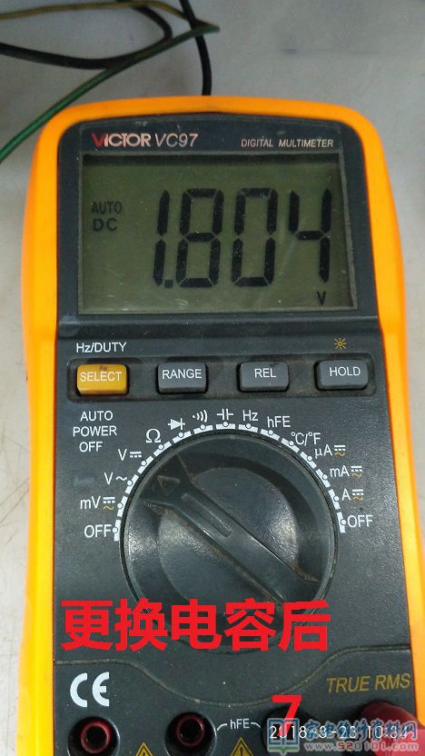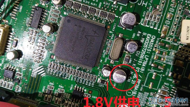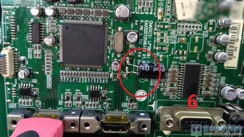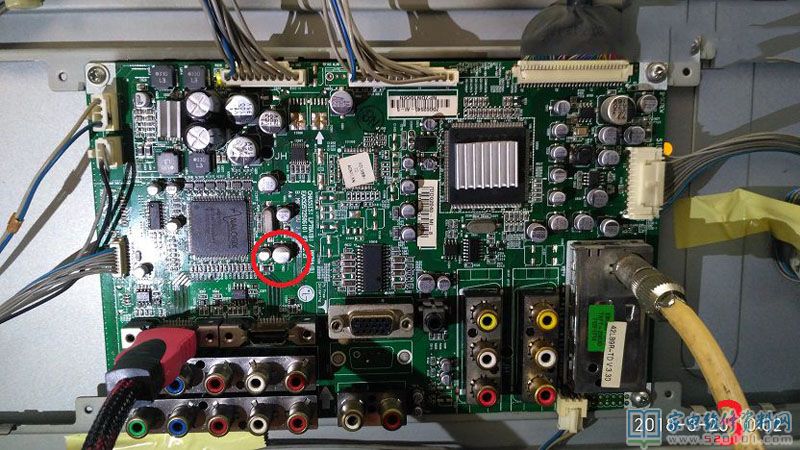 拆开机器检查看电源板和主板,并没有发现鼓包的电容,由于AV和TV是完全正常的,故障紧限于HDMI电路部分,而且热机后故障有改善,故判断是电容的可能性最大,于是用热风枪局部加热,最终确定故障部位(下图中红圈标注)。