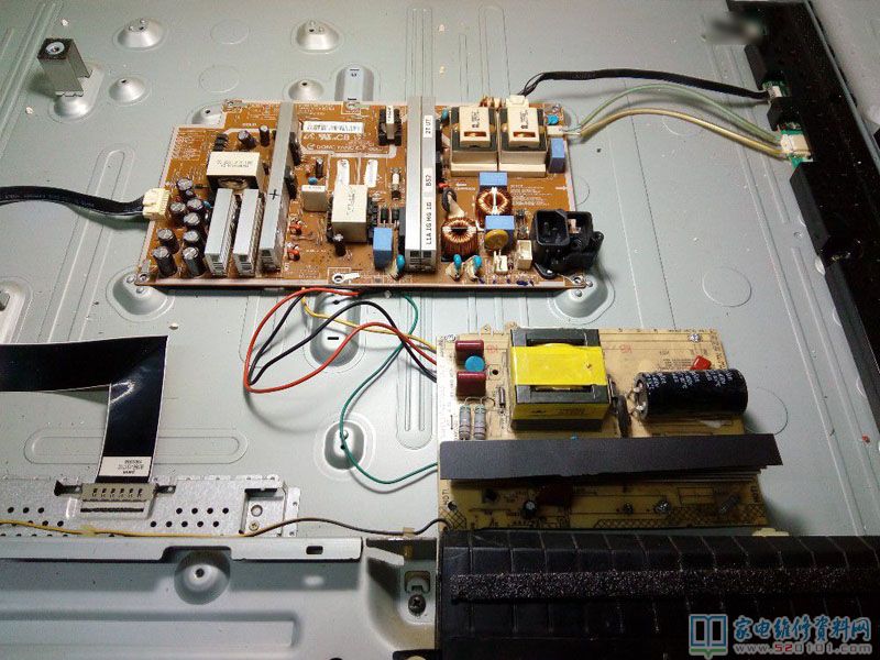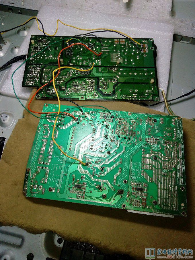 考虑到该机已占用大量时间与精力,不能再折腾了,已失去耐心了,决定用嫁接法维修。在以往换下的旧电源板中(平时很少换板,特别是电源板,总觉得维修人员换板维修是技术不精,不光彩),找到一块康佳康佳KPS300-01(3405553),坏电源板,测量PFC部分对管正常,应该是好的,桥+、桥-、PFC+、VCC供电,接4根线,开机PFC电压为409V,把康佳板的RF905、906分别贴片电阻由514(0805)换成474、434(1206),PFC最终调整为384V。嫁接的板子用短磁柱安装在原电源板的右下方,在散热片上贴上绝缘片,并在后壳对应位置再加一层绝缘垫片(因该机后壳是铁皮的)。