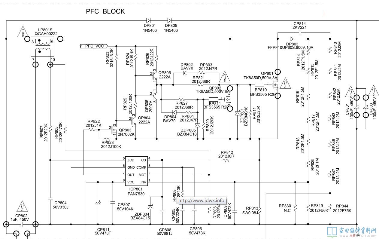 反复检测,替换维修,仍然屡损开关管——原因不明(也许是受潮引起的PFC变压器跳火)换这换那,哪个都是好的,该代换的都换了,就是不行,最长的开机50分钟左右三无,而且坏的时候,管子表面温度都不高,前后换了3只FAN7530与4只场效应开关管(不同型号批次),有朋友说,尖峰吸收电路,可这款PFC却找不到吸收电路在哪,图纸实物都未找到。