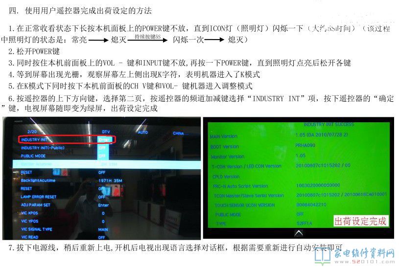 接一用户保修说他家夏普LCD-46FF1A液晶电视有问题,上门一看故障表现是灯闪,应该是老毛病,拉机回维修。这个故障,不是电源板,就是灯条。好办,打开后盖,取开电源板去主板的两条排线,短路电源5V与开关机 与OFL 与SBT脚,背光闪一下就没有了,确认判端没错。用点灯器点灯条,蓝色那组可点亮,红色不可点亮,在X宝上定灯4条。怕电流不同,全换掉安全一点,换了灯条,还是不插主板排线,强行开电源,灯全亮起来了,证明OK。小心装屏。全装好,开机灯还闪,还要进总线去保护。同时按电源 V- 信源 进总线,(这里很多师付说进不去,要多试试,要有耐心)再按V- A- 进总线,第二页 第一项 出厂设置。拔掉电源线,再插电,设一下基本的开机。搞定,收工。