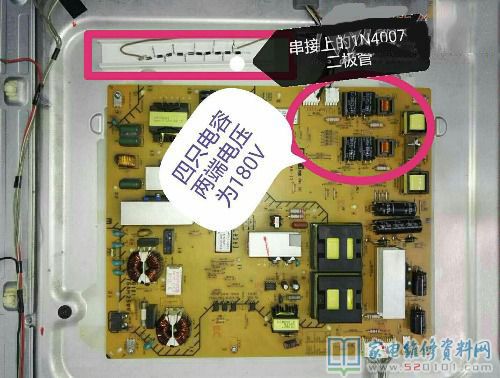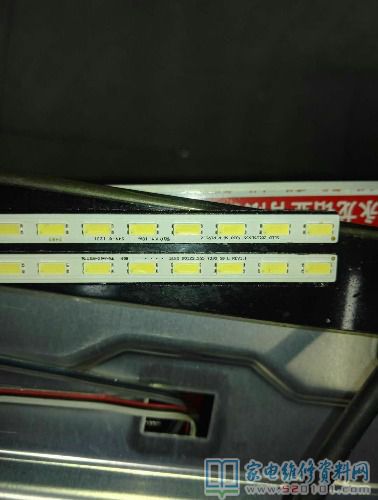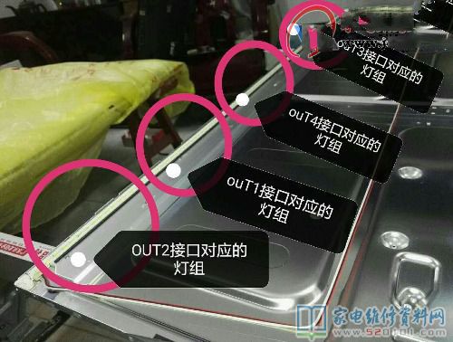 该电视LED灯条安装在电视上方,左右条一条,每条二组,每组29只LED灯珠,压降5V(实测),灯珠型号:7030灯条型号:SLED2012SLS55 7030 58。装上灯条,接上电路,试机一切正常。再装上液晶屏,一切OK。本来维修到此完成,该机有智能背光调节功能,为了得知没接上光感器是什么故障灯提示,没考虑清楚就拔开光感器电路板,通电,开始还能点亮屏幕,没过多久就出现黑屏保护,红灯又闪6次,再用点灯仪测试,ouT3对应的灯条又烧开路了,真是好事多磨,没办法只能再开屏,经查OUT3对应灯组其中一只烧断开路,为节省成本,再没换灯条,把烧坏的LED灯用细线短接,通电基本正常,再测各灯组电压降,其中短接的那组比其它灯组少了6v,为使恒流电路各路电压平衡,在少6v的那一组串上8只IN4007二极管,到此四路灯组基本平衡,再试c6817、c6818、c6823、c6824两端电压基本都是180V,到此才完成修理。该机已运行一个多月,欠缺的是短接灯组的那个地方有一小暗区,没仔细看是看不出,客户还能接受。