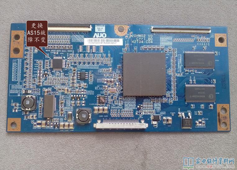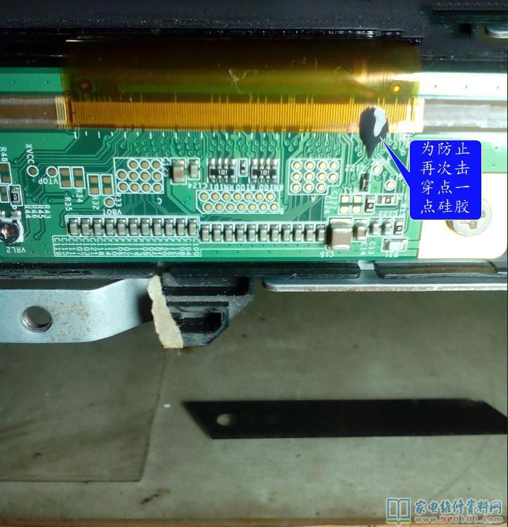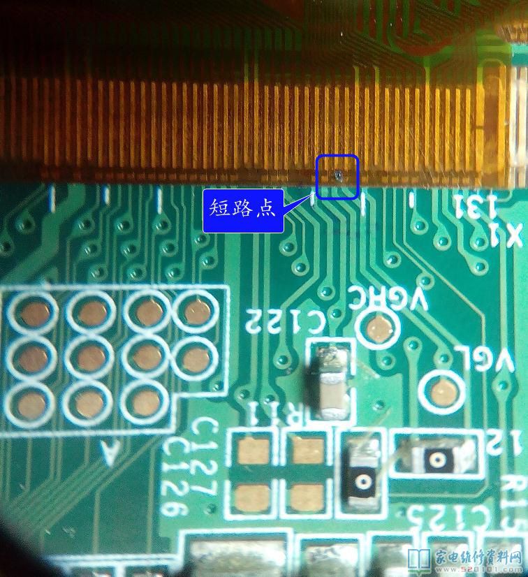 接修一台索尼组装机,故障表现为静止图像正常,运动图像出现拖尾有残影,测逻辑板VGH,VGL电压正常,更换AS15故障不变。拔掉一侧排线,半屏图像正常。怀疑屏边板和屏有问题。将屏压边条拆下,测边条上的VGH为-0.6V,VGL-5V,边条两侧的电压都一样,怀疑VGH有短路的地方。拔掉一侧排线,半屏图像正常,这一侧的VGH电压上升到正常的25v。起初怀疑边耳朵短路,准备撕耳朵。为慎重起见,先跑跑线路,先把进屏的VGH线路条断开再说。拿出高倍放大镜,从VGH测试点起,一路观察到屏边,忽然发现屏边上有一小黑点,再仔细一看,像是烧灼的黑点,再跑一下线路,黑点处在VGH和VHL之间,原来VGH和VGL击穿短路了。赶紧拿出壁纸刀片,将短路点划开,通电试机图像正常。