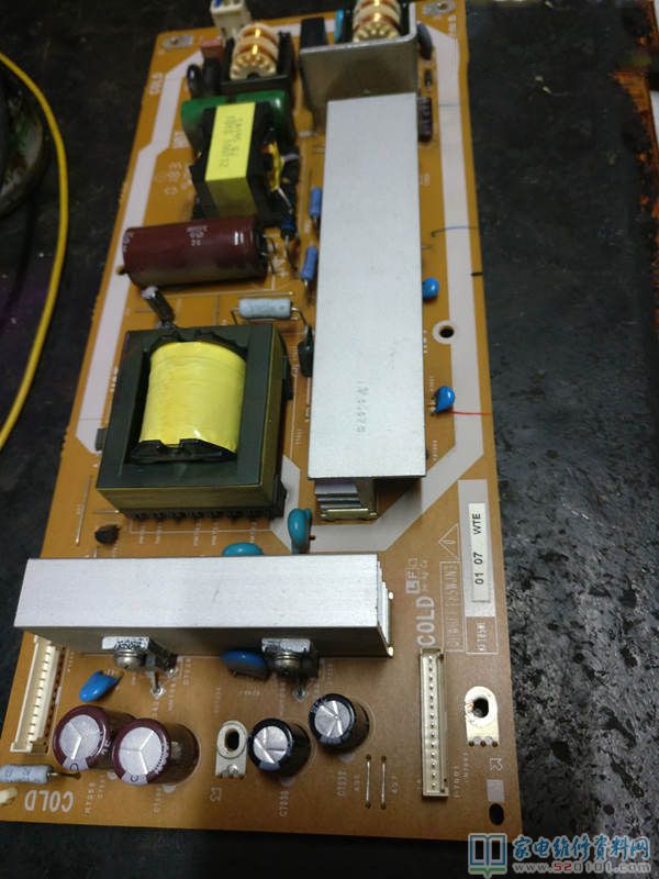 和客户谈好维修的价格,拆开电视后盖,目测电源板表面,没发现明显的烧坏痕迹。只好用表测量一下电源滤波两端电压320V左右,测输出端电压12V、24V都没有了。又只好拆下电源板固定螺丝,翻看底面,见底面全是贴片元件了;其中有两个贴片IC:IC7002为电源控制块(NCP1230 标号30D16),IC7001为PFC块(NCP1606)。