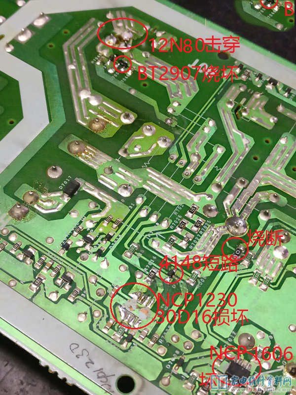 仔细看,发现有个标注000电阻烧黑了,顺着这条线路走,用表测量一下D7012(4148)二极管,也开路了;测Q7006(10N80)场效管,也击穿了,再测场效管旁边的Q7005(T4403用BT2907代换)也短路了。