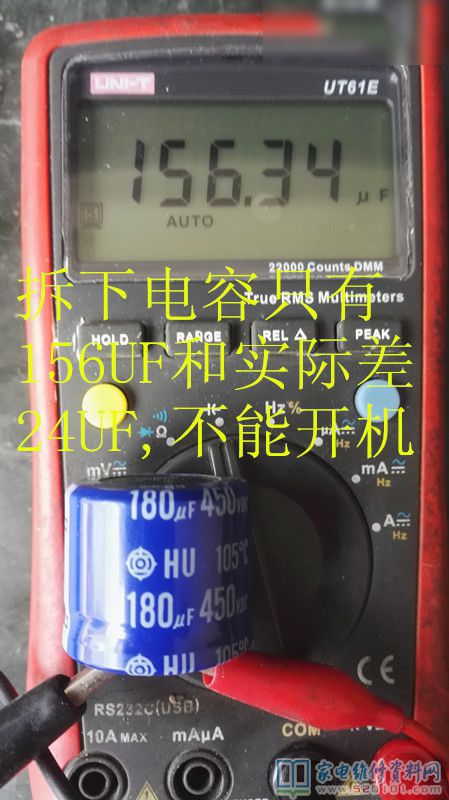 在昨天接修一台日立HITACHI 26LD8000TC液晶电视,故障现象同上面一样毛病,开机指示灯亮几秒钟就灭,开盖测5V电压,开机5V正常马上下降到0V,补焊5V电源芯片无效, 直接拆下电源300V电容,用表测180UF电容减少156UF,相差24UF容量就不能开机,。看来液晶电源电容,容量不能减少代换。
