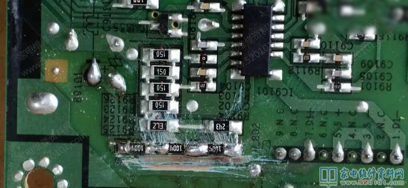 网上搜索有说场管的,有说芯片的,更多人说是背光,用点灯仪测量电压正常且屏上无暗光,亮度平衡所以确定背光灯条完好,恒流部分问题,通过分认为取样电路造成,检查发现取样的三只大电阻(三只1004电阻)有漏电的可能,取下电阻清洁刮干尽线路板,还原电路后故障修复,试机一切正常。