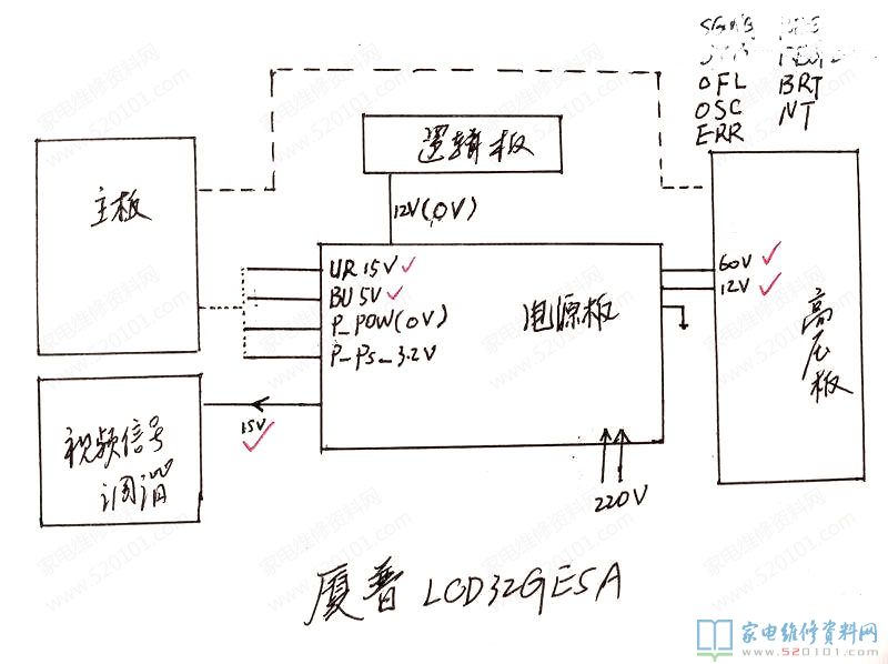 接修一台夏普LCD32GE5A液晶电视,故障现象是通电后,红色指示灯亮,无背光。从原始设置接口中输入音频信号喇叭无声音。初步检查电源板正面晶体管、集成电路无炸裂、清一色化工电容无一鼓包。测高压板12V与60V正常;视频信号板块15V供电正常;主板1UR-15V正常,BU-5V正常,POW为0V, PS-ON为3.2V;逻辑板12V供电为0V,它由SK8001FEE及周边管控电路构成。高压板上STB、OFL、ERR、REG2处电压均为0V。根据以上测得的数据,可以判断故障由主板造成,正是因为主板无PNL_POW信号输出到SK8001才使得逻辑板供电为0v,更换主板后故障修复。