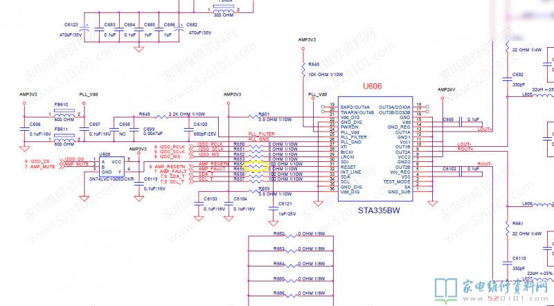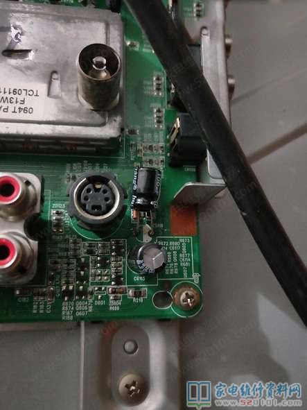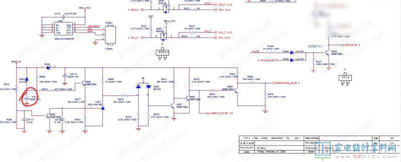 由此判断是开关机静噪电路问题,测量Q605的B极为0V,不用说一定是电容短路了,当即拆下C6116电容,测量果然短路了,换上16V100UF电容,开机声像一切正常,故障修复。