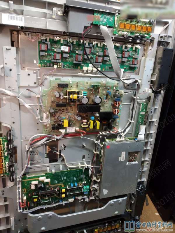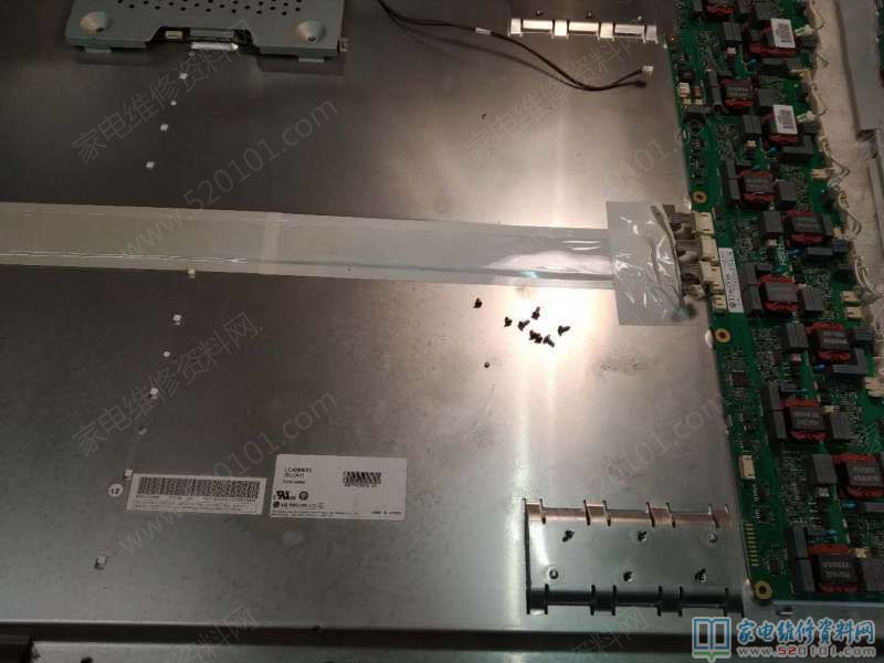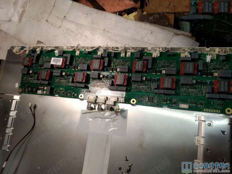 打开后盖,里面电路异常复杂,主板有铁盖严密屏蔽,两块电源板,一块给主板供电,一块给高压板和环形彩灯供电,功耗惊人!这个屏幕是LG早期的屏幕,已经绝版。拆下高压板的铁盖,里面电路竟然和平常我们接触的电路大相径庭,简直是地球人和外星人的区别。