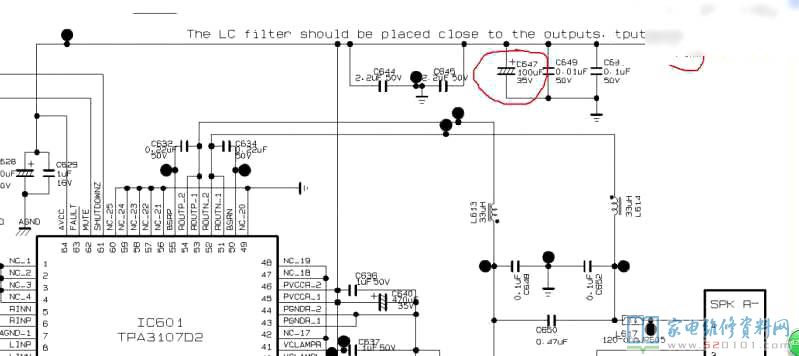 接修一台LG 42LC7R-TA液晶电视,故障表现为伴音的沙沙声随音量增大而增大,就是没有电视信号是也是如此,估计是伴音功放电路上的问题。查看此机型图纸,初步判断是IC601的64脚19V供电电路上的问题最可疑,这一路上的一个电感L618和35V/100uF的C647可能影响最大。由于C647贴片铝电容不容易拆,先把电感L618用热风枪烤下,然后清理了基板上的固定胶(有过固定胶漏电的经验),再把L618翻个面焊上。装好板子试机1小时,再也没有沙沙声出现,伴音变得很干净,故障排除。
